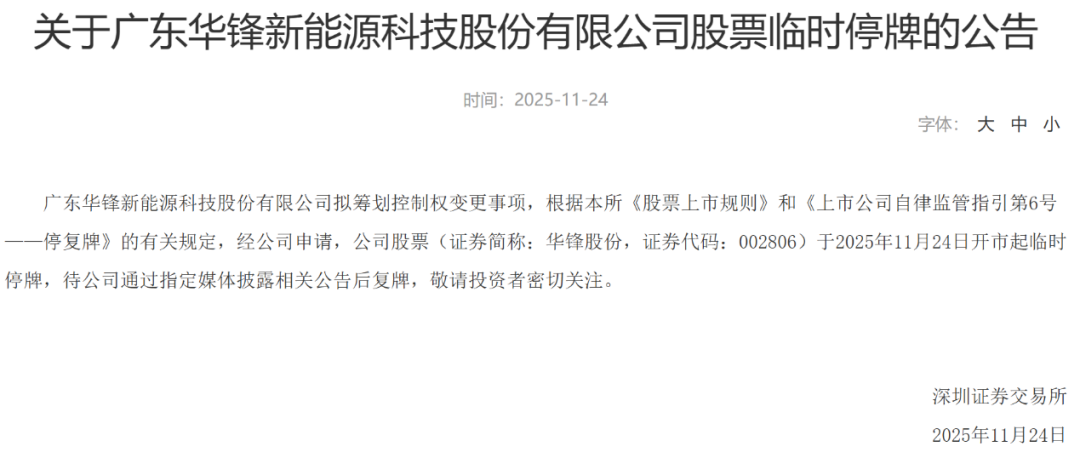 11月24日上午,深交所发布公告称,广东华丰新能源科技股份有限公司拟变更经营权。根据本所《股票上市规则》和《上市公司停复牌自律监管指引第6号》的规定,根据公司要求,公司股票(股票简称:卡峰股份,股票代码:002806)自2025年11月24日起停牌。