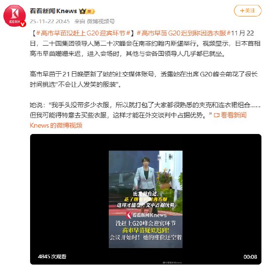 【#高市早苗未能赶上G20欢迎会#】#高市早苗因服装选择迟到G20#11月22日,第二十届G20领导人峰会在南非约翰内斯堡举行。视频显示日本首相高市早苗迟到。当他进入会场时,其他与会国家的领导人几乎都已入座。